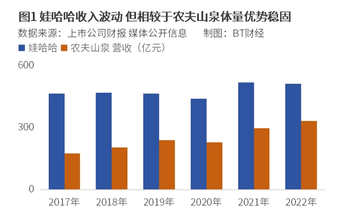 但即便娃哈哈是在营收的低谷,也就是460亿元左右,它的收入体量也高于农夫山泉。据后者财报显示,从2017年到2022年,公司营收从不到175亿元增长到超330亿元。