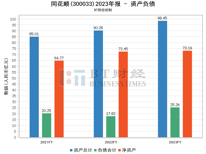 在资产负债方面,同花顺的总资产从年初的90.28亿元增长到年末的98.45亿元,增长了9.05%。负债总额也从年初的17.82亿元增加到年末的25.26亿元。尽管负债有所增加,但公司的净资产也实现了增长,从年初的72.45亿元微增至73.19亿元。资产负债率从年初的19.74%上升到了年末的25.65%,反映出公司财务杠杆的提升。
