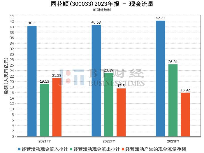 在现金流量方面,同花顺的经营活动产生的现金流量净额从上年同期的17.5亿元减少到15.92亿元,下降了9.01%。经营活动产生的现金流入总计为42.23亿元,而现金流出总计为26.31亿元,较上年同期分别有所增加和减少。