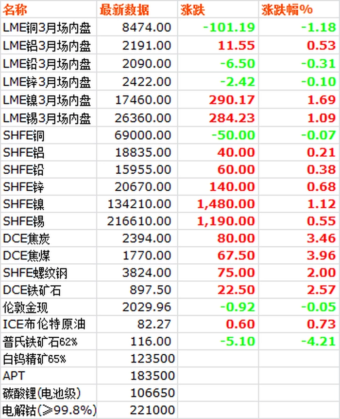 2月27日,LME六种基本金属价格涨多跌少,镍领涨,铅锌小幅下跌。三月期铜价收于8474美元/吨,上涨0.09%。三月期铝价收于2191.5美元/吨,上涨0.53%。三月期铅价收于2090.5美元/吨,下跌0.31%。三月期锌价收于2422美元/吨,下跌0.10%。三月期锡价收于26360美元/吨,上涨1.09%。三月期镍价收于17460美元/吨,上涨1.69%。