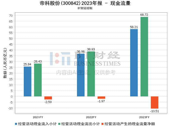现金流量方面,帝科股份的经营活动产生的现金流量净额为负10.51亿元,相比上年的负1.97亿元下降了较多。尽管如此,经营活动产生的现金流入总计为58.21亿元,较上年同期的36.96亿元有所增加。现金流出也从38.93亿元增长到了68.72亿元,这可能与公司为了扩大生产规模,增加原材料采购和备货等经营活动有关。