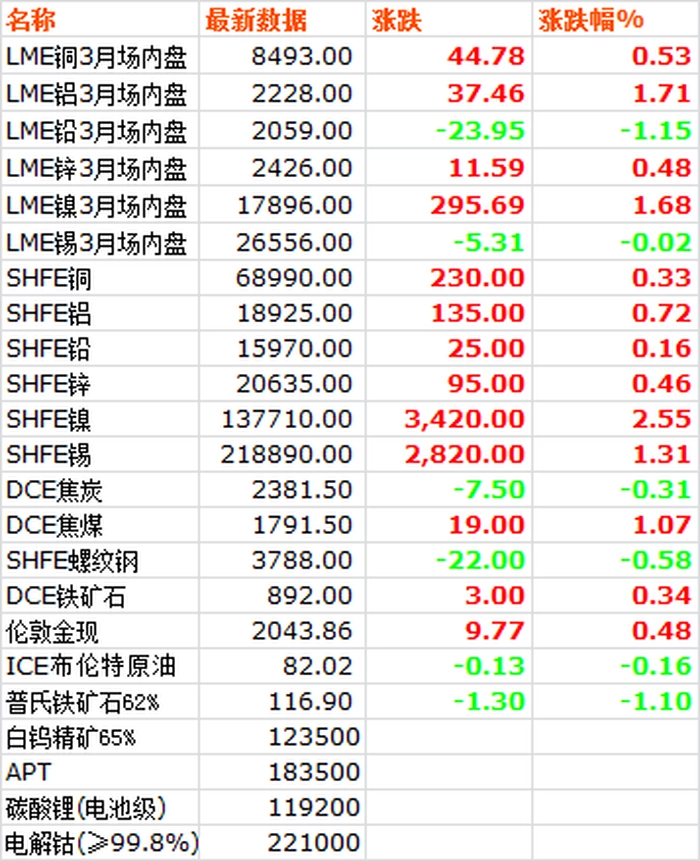 2月29日,LME六种基本金属价格涨多跌少,铝镍涨幅居前。三月期铜价偏强震荡,收于8493.5美元/吨,上涨0.53%。三月期铝价震荡上行,收于2228美元/吨,上涨1.71%。三月期铅价收于2059美元/吨,下跌1.15%。三月期锌价收于2426美元/吨,上涨0.48%。三月期锡价收于26556美元/吨,下跌0.02%。三月期镍价收于17896美元/吨,上涨1.68%。