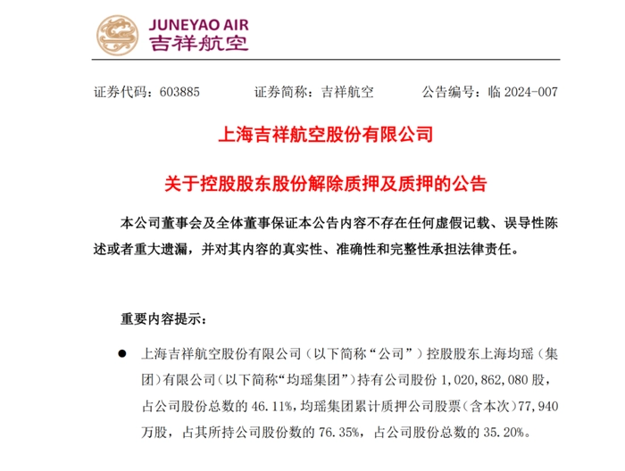 2月8日,吉祥航空发布公告称,其控股股东均瑶集团持有公司股份10.21亿股,占公司股份总数的46.11%,均瑶集团累计质押公司股票约7.79亿股,占其所持公司股份数的76.35%,占公司股份总数的35.2%。