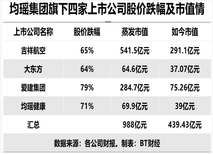 通过均瑶集团旗下四家上市公司的财报分析可以发现,疫情三年内四家公司的归母净利润几乎都是处于下滑状态。2023年前三季度,吉祥航空和均瑶健康净利润为正增长,爱建集团和大东方均为负增长。旗下四家上市公司截至2月26日收盘,总市值为439.43亿元。其中大东方股价下跌64%,市值蒸发64.6亿元;爱建集团股价下跌79%,市值蒸发284.7亿元;均瑶健康股价下跌71%,市值蒸发96.9亿元,加上吉祥航空的市值蒸发541.5亿元,均瑶集团四家上市公司总市值已经跌去988亿元。