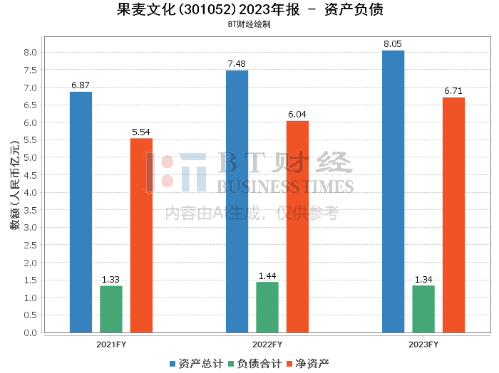 在资产负债方面,果麦文化2023年末的总资产达到8.05亿元,较期初的7.48亿元增长了7.70%。负债总额为1.34亿元,较期初的1.44亿元略有下降,显示出公司的财务结构更为稳健。净资产从期初的6.04亿元增长至6.71亿元,资产负债率从19.22%降至16.64%,表明公司的偿债能力有所增强。