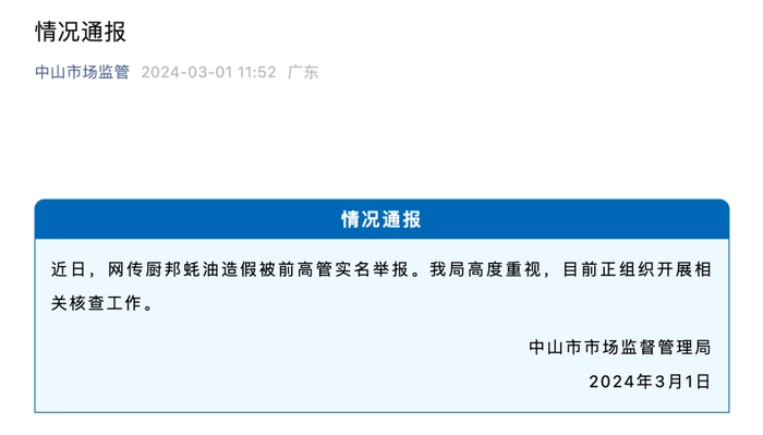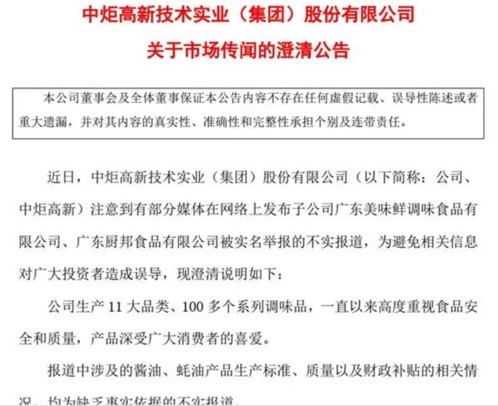 据《每日经济新闻》报道,3月1日中山市市场监督管理局发布通告称,针对网传厨邦蚝油造假被前高管实名举报,已经组织开展相关核查工作。随后中炬高新发布公告称前高管实名举报消息为不实报道,报道中涉及的酱油、蚝油产品生产标准、质量以及财政补贴的相关情况,均为缺乏事实依据的不实报道。公司各项生产经营均合法合规,所生产的产品严格遵守国家各项食品安全管理的相关规定。