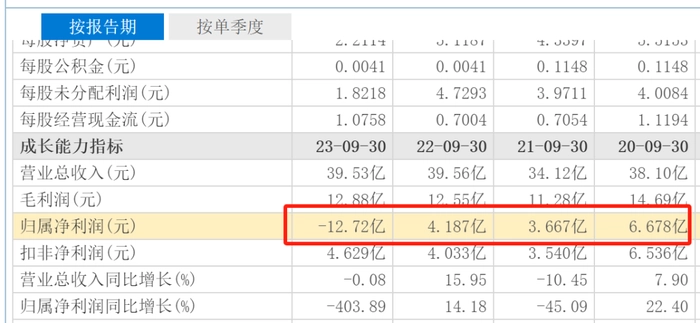 因中炬高新在3月26日才披露2023年年报,只能以2023年三季报为参考。2023年前三季度在,中炬高新营收39.53亿元,同比下滑0.08%;归母净利润-12.72亿元,同比增长-403.89%。这也是中炬高新上市以来首次三季报亏损,上一年同期归母净利润为4.187亿元,同比增长14.18%。