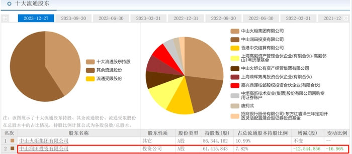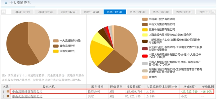 姚振华控制一家上市公司后,基本都是走减持路线,2022年年底,姚振华控制的中山润田投资有限公司持有中炬高新14.73的股份,但在报告期内减持23527549股,此时姚振华仍是第一大股东,且和第二位中山火炬集团有限公司有较大的优势,此时中山火炬的持股比例为10.88%。