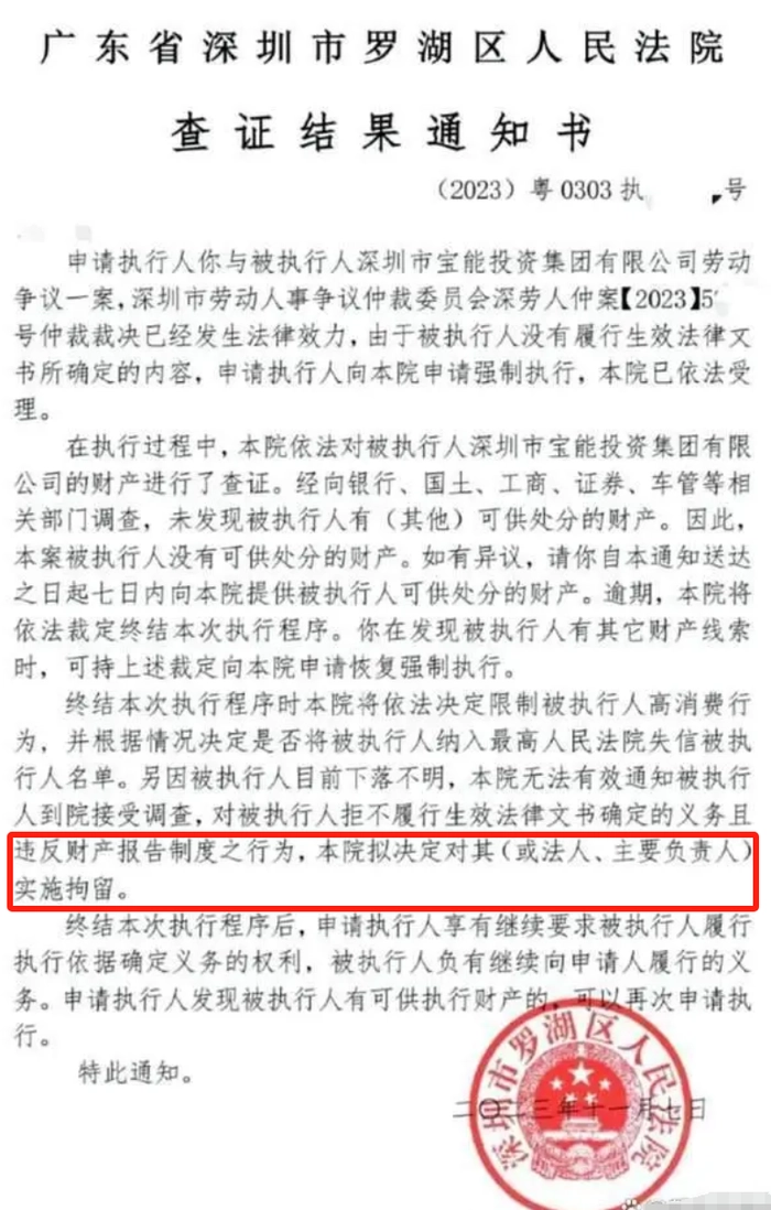 而这次“躺枪”姚振华已经很久没有在公开场合露面,早在2023年11月7日就传出姚振华被刑拘的传闻,当时深圳市罗湖区人民法院还下发了查证结果通知书。该通知书称“本院拟决定对其法人或主要负责人实施拘留。”该通知书中使用了“下落不明”的被执行人,此时宝能集团并没有破产,公司还在,不存在下落不明,由此推断,“下落不明”或是指的姚振华。而“实施拘留”的表述,在此前宝能与债权人、前员工的纠纷案中,很少出现。可见问题的严重性。