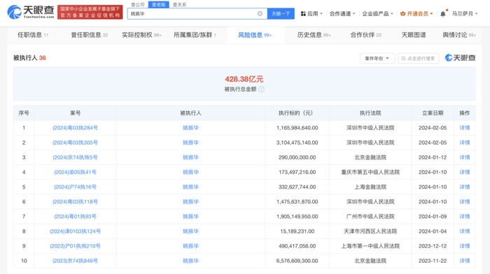 在天眼查风险信息显示中,深圳市宝能投资集团有限公司也就是在姚振华名下的被执行人信息多达36条,被执行金额达428.38亿元。从曾经的身价超过千亿,到如今负债数百亿元,姚振华的经营情况是每况愈下。