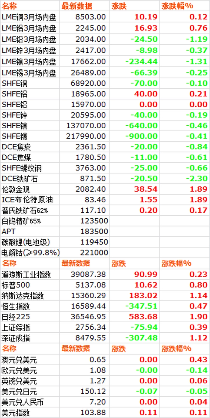 3月1日,LME六种基本金属价格跌多涨少,铜铝上涨,镍跌幅居前。三月期铜价先抑后扬,收于8503.5美元/吨,上涨0.12%。三月期铝价先抑后扬,收于2245美元/吨,上涨0.76%。三月期铅价收于2034.5美元/吨,下跌1.19%。三月期锌价收于2417美元/吨,下跌0.37%。三月期锡价收于26489美元/吨,下跌0.25%。三月期镍价下跌后小幅反弹,收于17662美元/吨,下跌1.31%