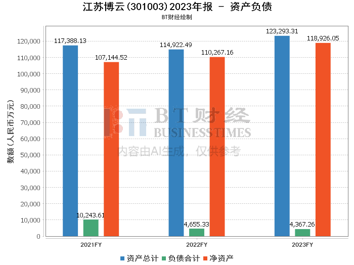 资产负债方面,江苏博云2023年末的总资产达到了12.33亿元,较期初的11.49亿元增长了7.28%。负债总额则从期初的4655.33万元减少到期末的4367.26万元,显示出公司在降低负债方面取得了一定的成效。净资产从期初的11.03亿元增长到期末的11.89亿元,增长率为7.85%,资产负债率从期初的4.05%下降到期末的3.54%,表明公司的财务结构更加稳健。