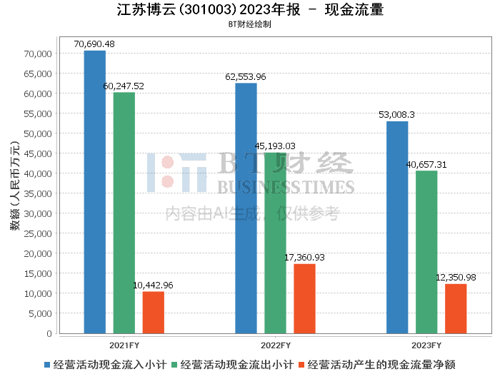 现金流量方面,江苏博云2023年度的经营活动产生的现金流量净额为1.24亿元,虽然较上年同期的1.74亿元下降了28.86%,但仍保持在一个健康的水平。现金流入小计为5.3亿元,现金流出小计为4.07亿元,公司保持了良好的现金流动性。
