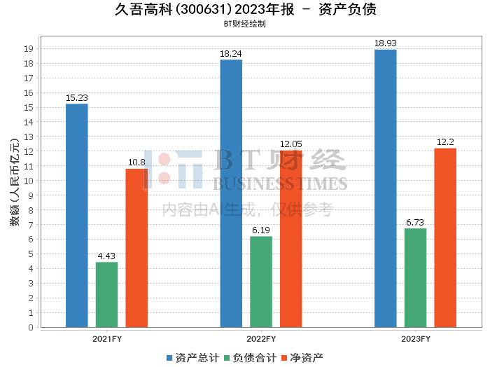 从资产负债方面来看,久吾高科2023年末的总资产为18.93亿元,较期初的18.24亿元增长了3.80%。负债总额从期初的6.19亿元增加到期末的6.73亿元,净资产从12.05亿元增长到12.2亿元。资产负债率略有上升,从33.94%增至35.54%,显示公司的财务结构相对稳定。