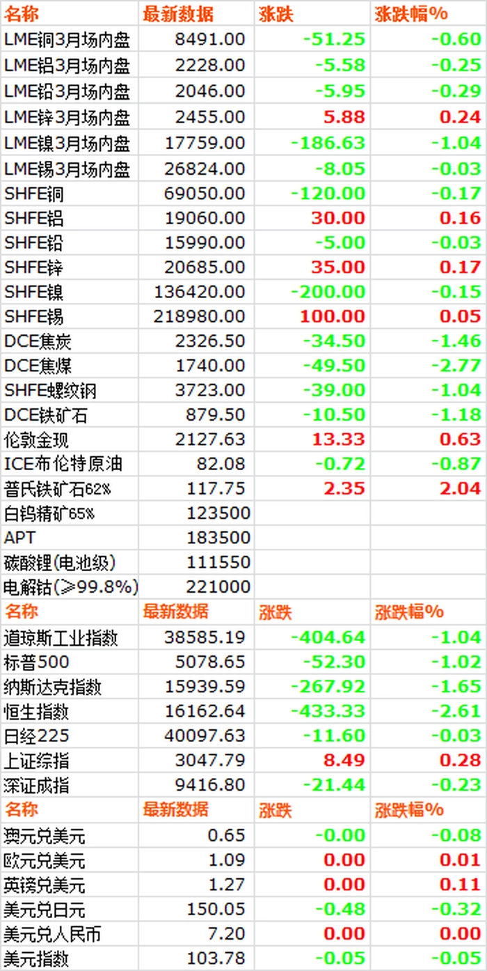 3月5日,LME六种基本金属价格跌多涨少,仅锌上涨,镍领跌。三月期铜价宽幅震荡,收于8491.5美元/吨,下跌0.60%。三月期铝价冲高回落,收于2228.5美元/吨,下跌0.25%。三月期铅价震荡回升,收于2046.5美元/吨,下跌0.29%。三月期锌价收于2455美元/吨,上涨0.24%。三月期锡价收于26824美元/吨,下跌0.03%。三月期镍价收于17759美元/吨,下跌1.04%。