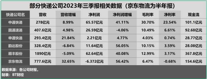 通过财报分析国内大部分的快递企业都是盈利的。2023年前三季度中通快递营收278亿元,同比增长8.99%;归母净利润65.57亿元,同比增长41.11%。期末现金及现金等价物余额为101.1亿元。毛利率为30.70%,净利率为23.54%。