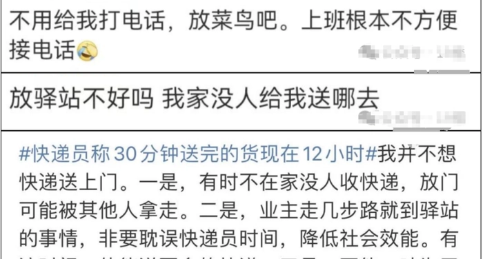 通达系某快递公司快递员王威表示自己每天的派送量约300件,如果每件都送货上门,是根本不可能完成的。“送件前会打电话确认家中有人没人,有些电话没人接,打了多少遍才打通又被告知家中没人,放家门口还是放快递柜成了难题,不仅大大增加工作量,还影响配送效率,数百个电话都够打上半天的,每件快递再送货上门,一天24小时不吃不喝都完成不了。现在一天送不到60单。”