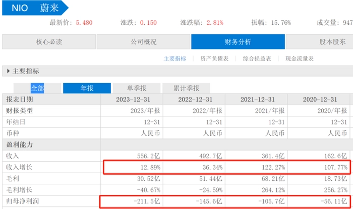 3月5日,蔚来发布2023年财报。财报显示2023年蔚来营收556.2亿元,同比增长12.89%,营收创上市以来新高。但归母净利润-211.5亿元,亏损同比扩大45.25%,同样辣眼睛。以蔚来在2023年的16万销量计算,每辆车净亏损13.22万元。这样的亏损,让30.7%的销量增幅略显无光。