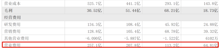 2023年蔚来的营业成本由441.2亿元增长至525.7亿元,同比增长19.13%。和上一年50.52的同比增长相比有较大下滑,但依然高于营收的整体增长。在营业费用方面,由2022年的207.8亿元增长至257.1亿元,同比增长23.68%。此前一年的增长幅度为83.65%。