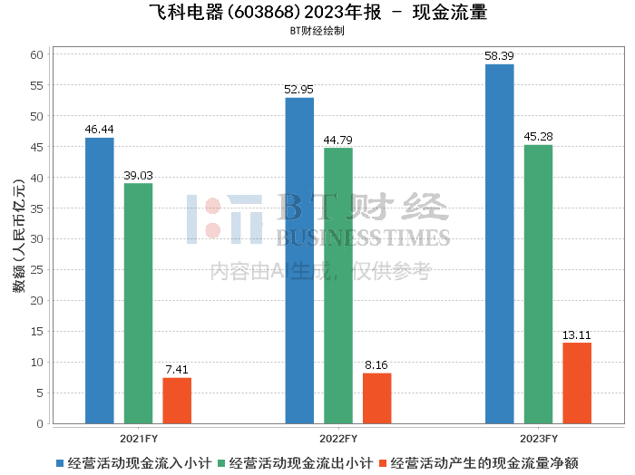 在现金流量方面,飞科电器的经营活动产生的现金流量净额从上年的8.16亿元大幅增长到13.11亿元,增长了60.66%,反映了公司经营效率的提升。经营活动产生的现金流入从上年的52.95亿元增长到58.39亿元,而经营活动产生的现金流出从44.79亿元增长到45.28亿元,现金流入的增长速度超过现金流出,显示了良好的现金流动性。