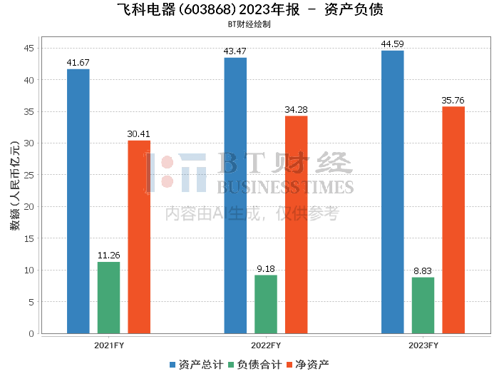 在资产负债方面,飞科电器的总资产从年初的43.47亿元增长到年末的44.59亿元,增长了2.59%。负债总额从年初的9.18亿元减少到年末的8.83亿元,减少了3.81%。净资产从年初的34.28亿元增长到年末的35.76亿元,增长了4.32%。资产负债率从年初的21.13%降低到年末的19.8%,显示公司的财务结构更加稳健。