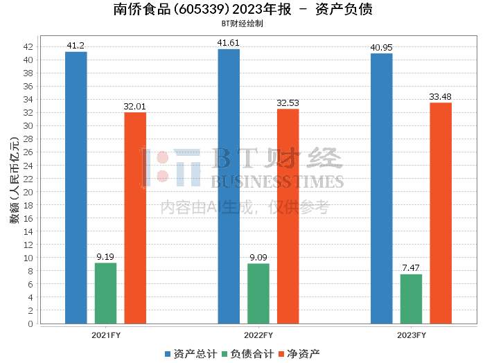 在资产负债方面,南侨食品2023年末总资产为40.95亿元,较期初的41.61亿元略有减少。负债总额从期初的9.09亿元减少至7.47亿元,净资产则从32.53亿元增长至33.48亿元。资产负债率从21.84%降至18.24%,显示公司财务结构更为稳健。