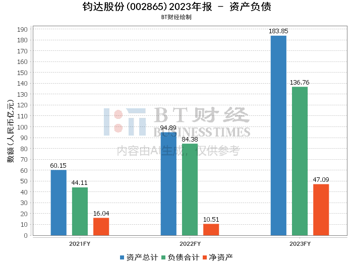 在资产负债方面,钧达股份的总资产从期初的90.98亿元增长至期末的183.85亿元,增长了102.08%。负债总额也有所增加,从期初的80.47亿元上升至期末的136.76亿元。尽管负债增加,净资产也实现了显著增长,从期初的10.51亿元增至47.09亿元,增长了348.14%。资产负债率有所下降,从期初的88.45%降至期末的74.39%,显示公司的资本结构得到了一定程度的优化。