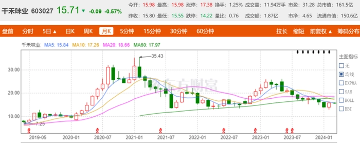 千禾味业的业绩表现也让其股价相比海天味业和中炬高新更加稳定。截至3月4日收盘,千禾味业股价15.71元,下跌0.57%,总市值161.5亿元,和高点股价相比跌幅55.7%。而同期海天味业和中炬高新的股价最高跌幅分别为68.3%和71%,同期两家总市值分别为2222亿元和189.3亿元,千禾味业依然是行业老三。