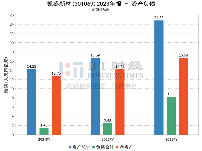 从资产负债方面来看,凯盛新材2023年末的总资产为24.83亿元,相比年初的16.69亿元增长了48.81%。负债总额在同一时期从2.48亿元增加至8.14亿元,净资产从14.21亿元增长至16.69亿元。资产负债率从年初的14.84%上升至年末的32.78%,显示公司的财务杠杆有所增加。