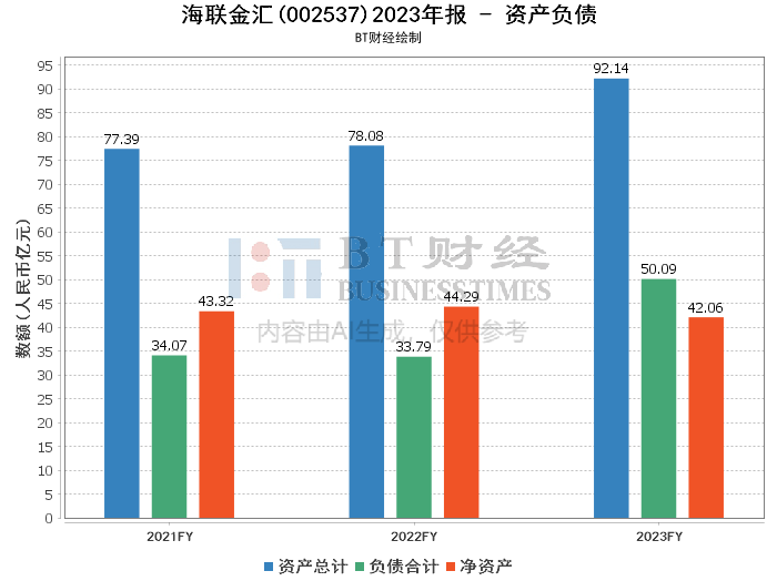 在资产负债方面,海联金汇的总资产从期初的78.08亿元增长至期末的92.14亿元,增长了18.01%。负债合计也从期初的33.79亿元上升至期末的50.09亿元。净资产则从期初的44.29亿元减少至期末的42.06亿元,减少了4.67%。资产负债率从期初的43.28%上升至期末的54.36%,反映出公司的财务杠杆有所增加。