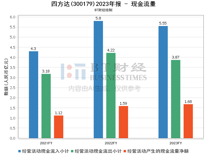 现金流量方面,四方达2023年的经营活动产生的现金流量净额为1.68亿元,较上年同期的1.59亿元有所增加,这表明公司经营活动的现金流入能力有所提升。经营活动现金流入小计为5.55亿元,而现金流出小计为3.87亿元,现金流的正增长有助于公司的稳定运营和未来投资。