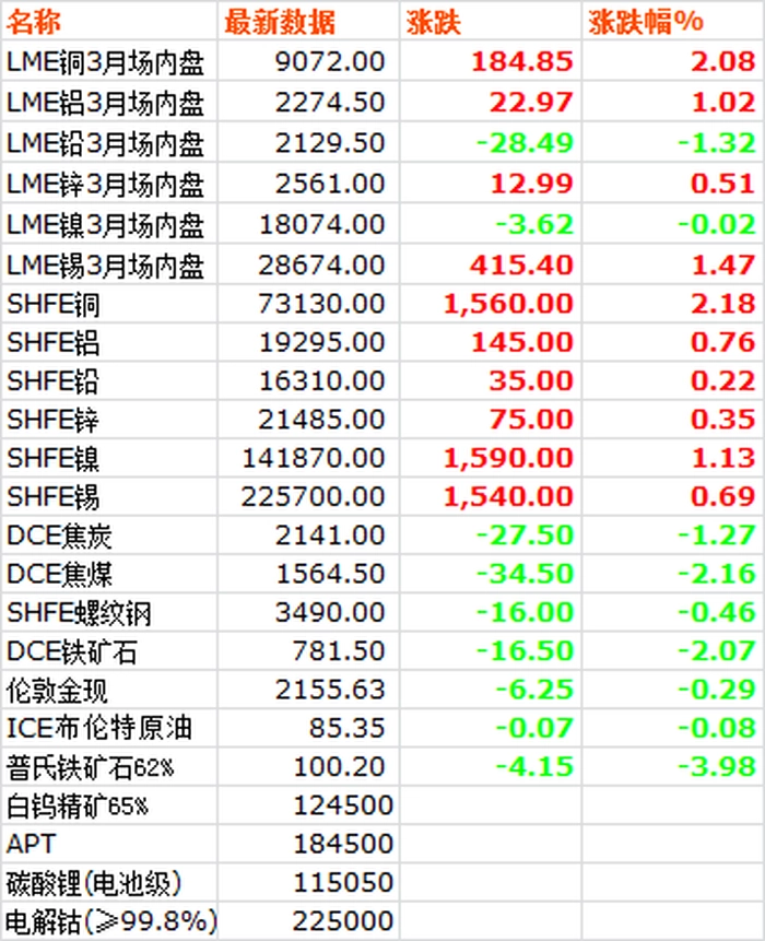 3月15日,LME六种基本金属价格涨多跌少,铅镍小幅下跌,铜领涨。三月期铜价收于9072美元/吨,上涨2.08%。三月期铝价宽幅震荡,收于2274.5美元/吨,上涨1.02%。三月期铅价持续回落,收于2129.5美元/吨,下跌1.32%。三月期锌价先扬后抑,收于2561美元/吨,上涨0.51%。三月期锡价收于28674美元/吨,上涨1.47%。三月期镍价收于18074美元/吨,下跌0.02%。