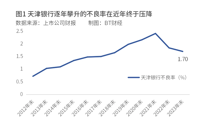 令人咋舌的是,回顾近十年,天津银行的不良率几乎只增不降。2012年末,天津银行不良率为0.72%,随后逐年攀升到1.03%、1.09%、1.34%、1.48%、1.50%、1.65%、1.98%、2.16%、2.41%,一直到2022年才终于出现了下降的势头,至1.84%。