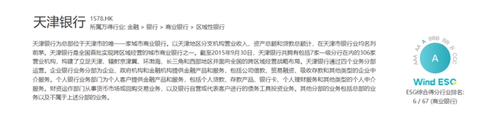 不过天津银行这两年的ESG工作得到了评级机构的认可。例如Wind ESG给该行A级、7.55分的较高评价,在同业67家商业银行里排名高居第六名。