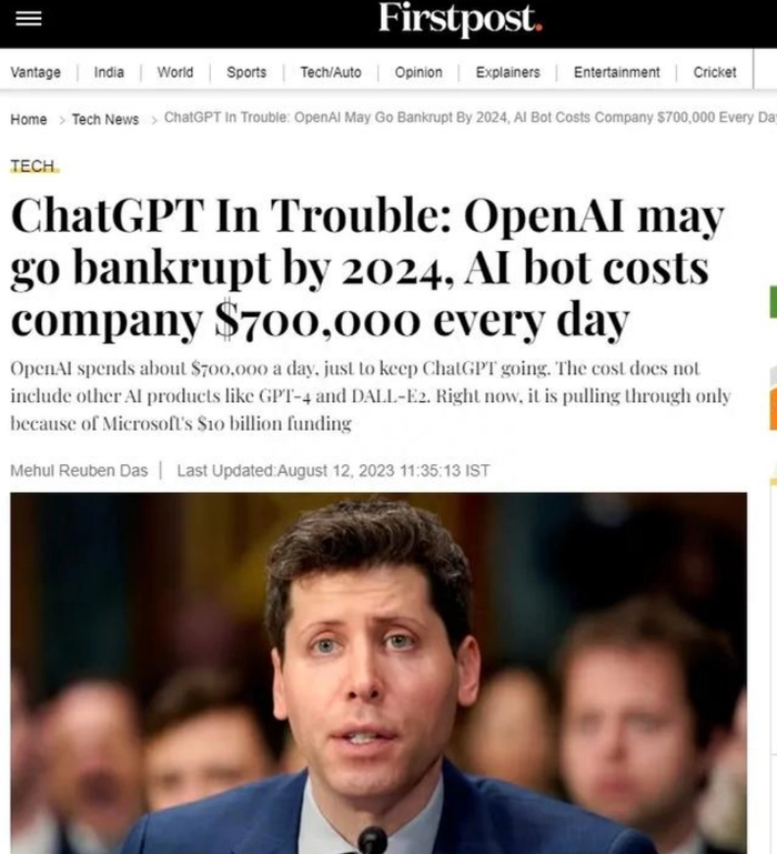 2023年1月,投资银行摩根士丹利的一份分析报告称,在 ChatGPT上回复的成本约为谷歌搜索查询平均成本的6倍至28倍。根据摩根士丹利最近的分析,谷歌去年3.3万亿次搜索的平均成本约为每次0.2美分。因此可以看出,ChatGPT聊天回复成本为1.2美分至5.6美分之间。根据公开的信息显示,GPT4一次完整的训练大约需要6000多万美元,报道所说的ChatGPT每天耗费70万美元,应该主要是数据中心的日常算力消耗。仅在2022年OpenAI 的财务净亏损就高达5.45 亿美元。甚至有印度媒体声称OpenAI有在2024年倒闭的可能。