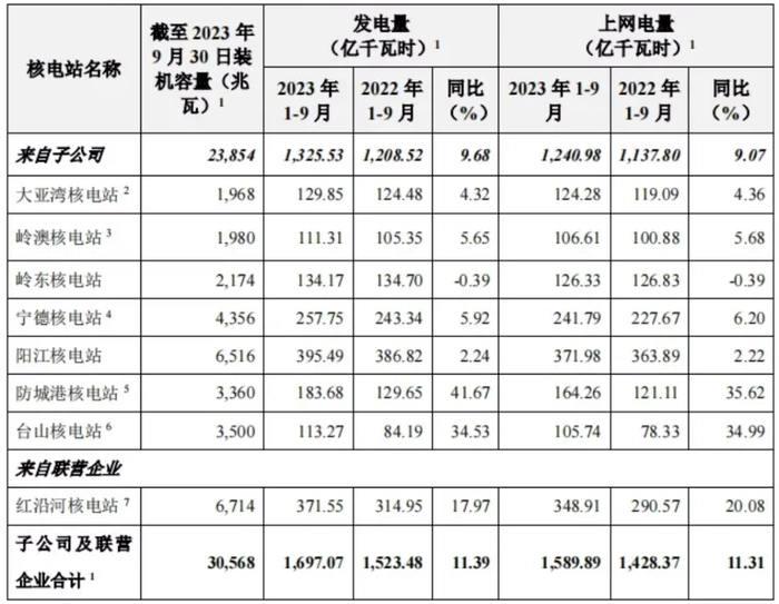 中国广核是目前国内最大的核电公司,目前尚未发布2023年年报,以2023年三季报数据来看,截至2023年9月30日,中国广核总发电量为1697.07亿千瓦时,平均到每季度,算上其11.39%左右的增幅,2023年全年发电量最高不超过2300亿千瓦时。