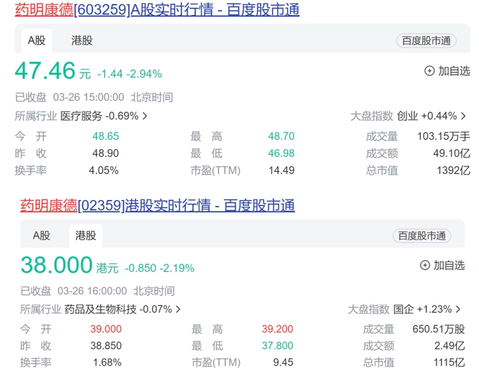 2021年,药明康德的股价创下171.08元/股的新高,但随后未能坚守,开始大幅回落。截至2024年3月26日收盘,药明康德的股价收盘再跌2.94%,47.46元的股价,较高峰值时跌幅已达72%。药明康德的港股股价表现也一路下跌,同期股价由最高的195.295港元跌至3月26日收盘38.000港元,跌幅超过80%。