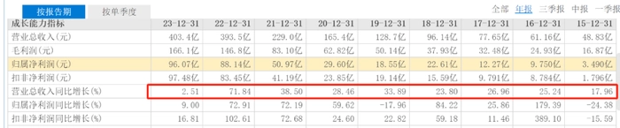 自2015年登陆A股后至2022年,药明康德的营收增速均在两位数以上。2015年17.96%的增速,竟然为这一期间的最低增速。2022年,药明康德的营收增速高达71.84%;而2023年的营收增速则直接暴跌至2.51%,和上一年的高增长形成了鲜明对比。