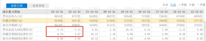 尽管“宇宙行”的行业地位短期内依然稳固,却自2022年起连续两年营收下滑,刚发布的2023年财报显示,工商银行2023年营收8431亿元,相比2022年的8757亿元减少了326亿元,下滑了3.73%。相比2021年9428亿元的营收更是减少近千亿元。