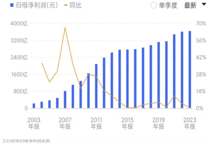 2023年工商银行的营收再度下滑3.73%,连续两年下跌,打破了此前营收没有连续下滑的纪录。尽管营收再度出现下滑,工商银行的归母净利润依然保持正增长,同比0.79%的增幅不算太高,却维持住工商银行净利润没有负增长的连续记录。财报显示自2003年以来,不管营收增长还是下滑,工商银行的归母净利润均保持正增长。但和2004年至2008年连续5年20%以上的净利润增幅相比,近几年增幅日益平缓,近三年净利润增幅分别为10.27%、3.67%和0.79%,从净利润增长幅度可以看出,工商银行的净利润增幅呈下滑趋势。