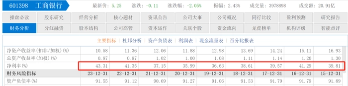 2023年工商银行净利率达3640亿元,每日净赚约10亿元。在营收出现小幅下滑的情况下,工商银行净利润能保持正增长得益于净利率的提升。2023年工商银行的净利率达43.31%,在2022年41.35%的基础上提升了1.96个百分点。且43.31%的净利率创下工商银行的历史新高,且净利率连续两年高于40%。此前2019年至2021年工商银行的净利率分别为36.63%、35.99%和37.15%,这三年工商银行的净利率均在40%以下。2022年工商银行的净利率一下提升4.2个百分点,成功再次迈入40%以上的高净利率行列。
