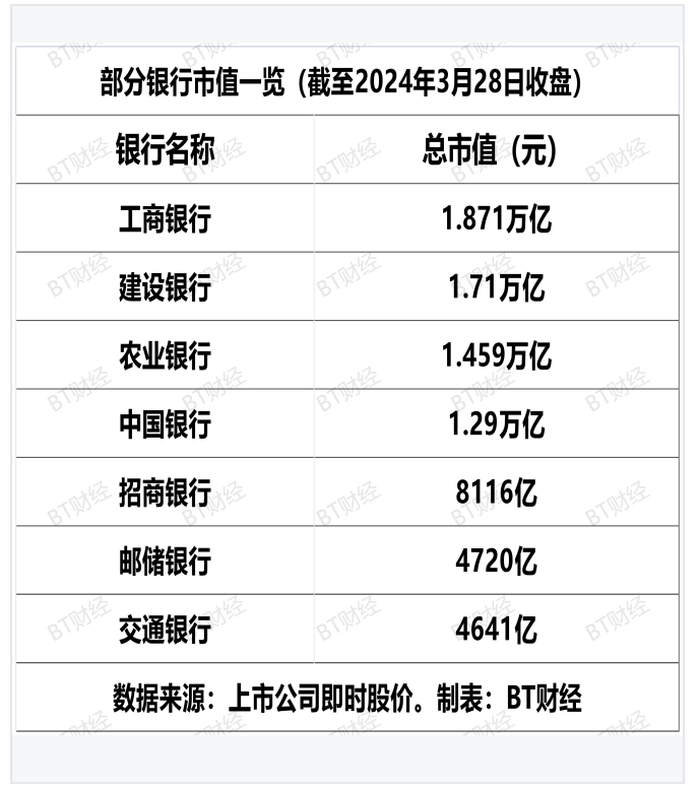 截至2024年3月28日收盘,工商银行以1.871万亿元的总市值,排名所有上市银行第一位,第二位是建设银行的1.71万亿元,第三位是农业银行的1.459万亿,第四位是中国银行的1.29万亿,这是目前A股中仅有4家市值过万亿的上市银行。