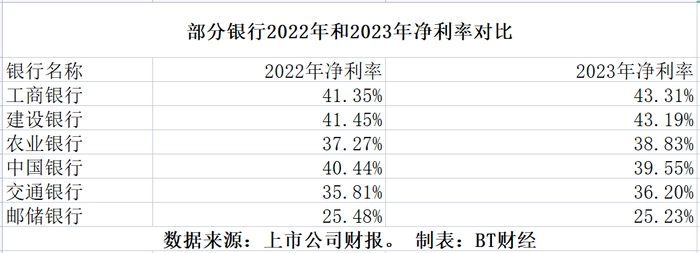 43.31%的净利率有多高?通过建设银行、农业银行和中国银行的同期数据对比可见一斑。2023年,建设银行的净利率为43.19%,农业银行的净利率为38.83%,中国银行的净利率为39.55%。同期另外六大行中的邮储银行和交通银行的净利率分别为25.23%和36.20%。工商银行的净利率在六大行中最高,最接近工商银行的是建设银行,在2022年41.45%的净利率一度高于工商银行的41.35%,但在2023年依然落后工商银行0.12个百分点。工商银行和建设银行也是六大行中唯二两家净利率超过40%的银行。