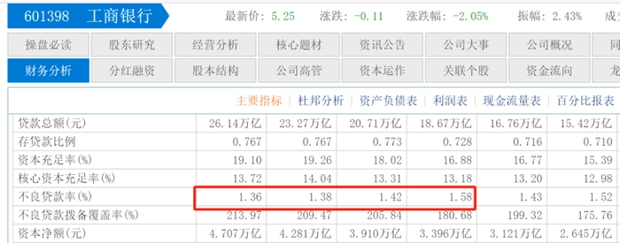 这已经是工商银行连续4年实现了不良率下降,2020年工商银行的不良率为1.58%,随后每年不良率均在下降。2021年的不良率下降至1.42%,下降了0.16个百分点。2022年的不良率继续下降至1.38%,下降了0.04个百分点。四年不良率总计下降了0.22个百分点。