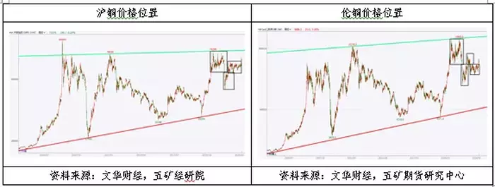 图4:沪铜和伦铜价格分别处在长期价格区间高位和中部偏高位置