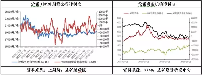 沪铝多头力量占优,伦铝空头撤退。沪铝盘面,2024年2月至3月,多头第三次主动大幅增仓冲击上方19500元/吨压力位。自2023年8月至2024年3月,多头主导价格走势,在多空博弈中更占优势,虽然价格未能成功向上突破阻力位,但价格重心已有所抬升。伦铝盘面,2月中下旬多头主动减仓导致铝价跌至2170美元/吨,3月空头主动减仓带动价格反弹至2270美元/吨,目前多空双方均延续减仓行为,价格延续区间窄幅波动。3月20日,沪铝收盘价19285元/吨,较上月同期18690元/吨上涨3.18%;伦铝收盘价2283.5美元/吨,较上月同期2223.5美元/吨上涨2.7%。