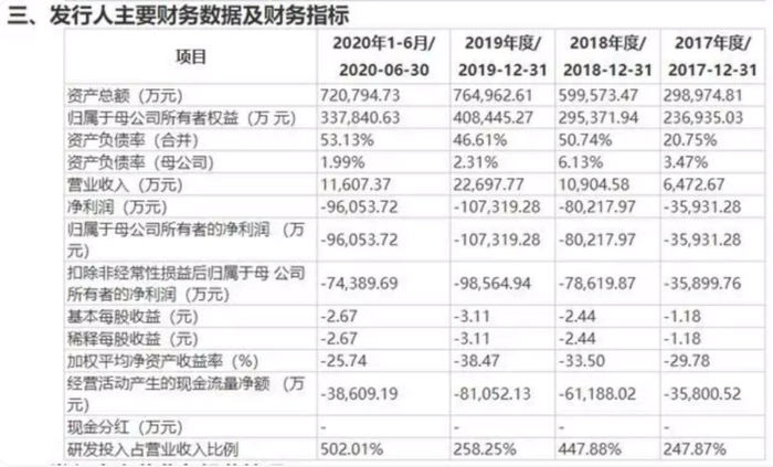 据柔宇科技此前招股书显示,光是在研发上,柔宇科技2017年至2020年上半年的费用支出分别为1.6亿元、4.88亿元、5.86亿元和5.83亿元,研发费用率分别高达247.87%、447.88%、258.25%、502.01%,3年的研发投入占营收比例高达308.17%。