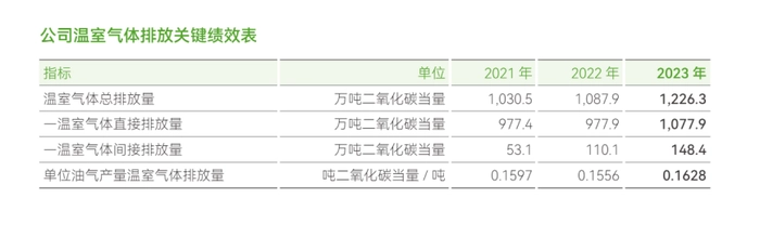 一些关键排放指标的表现在2023年出现了抬头。例如最受市场关注、常用来横向比较的温室气体直接和间接排放量数据显示,2023年中国海油二者分别施行了1077.9和148.4万吨二氧化碳当量的排放,较2022年的977.9和110.1万吨二氧化碳当量有显著的提高。