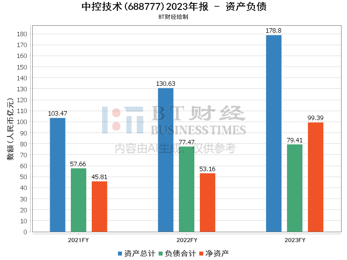 在资产负债方面,中控技术2023年的总资产达到了178.8亿元,较期初的130.63亿元增长了36.88%,显示出公司资产规模的快速扩张。其中,负债总额为79.41亿元,相比期初的77.47亿元略有增加,但净资产从期初的53.16亿元大幅增长至99.39亿元,资产负债率从期初的59.3%降至44.41%,反映出公司财务结构的优化和健康度提升。