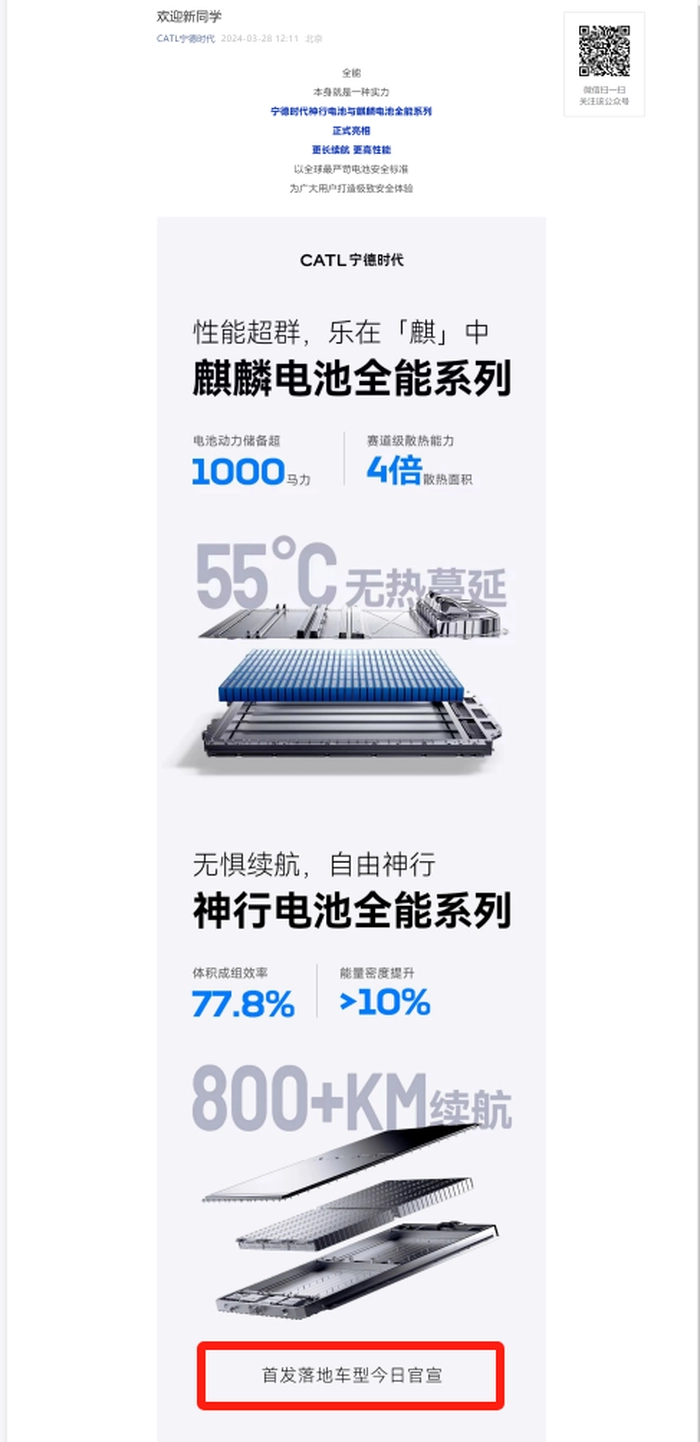 3月28日中午宁德时代官方公众号上宣布推出神行电池和麒麟电池两款新型电池,公众号以“性能超群,乐在麒中”为宣传语,标注续航里程800+KM,而其中一句“首发落地车型今日官宣”引起诸多关注。